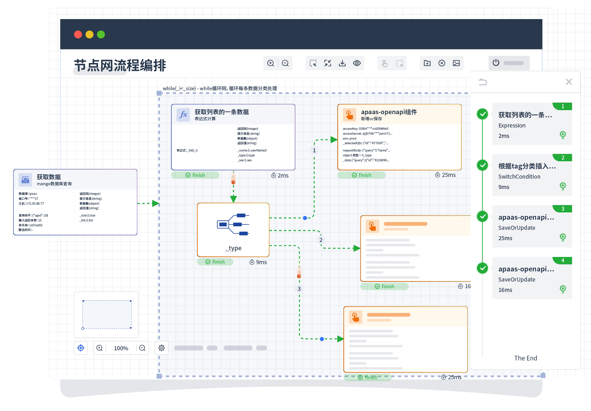 针对集成场景,,,,组件定义后支持进行流程编制,,,不同于传统代码方式,,,,通过图形化展示,,,,支持在线调试、、、日志查看和运行回放。。。。